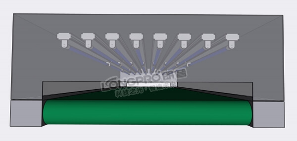朗普科技(LONGPRO)根據(jù)紫外殺菌劑量(參考GB15981標(biāo)準(zhǔn))要求,選用朗普高強(qiáng)度紫外線殺菌燈HL-840(單燈150W,1m紫外強(qiáng)度:≥580μW/cm2)通過計(jì)算所需數(shù)量為8盞,紫外劑量≥ 20,000μW.s/cm2。紫外線燈安裝在輸送線內(nèi)部上方4盞,下方4盞(采用滾軸傳送,便于紫外線有效照射信件底部), 快遞信件在輸送線上勻速通過,紫外線照射時(shí)間≥5s,從而快速有效殺菌。