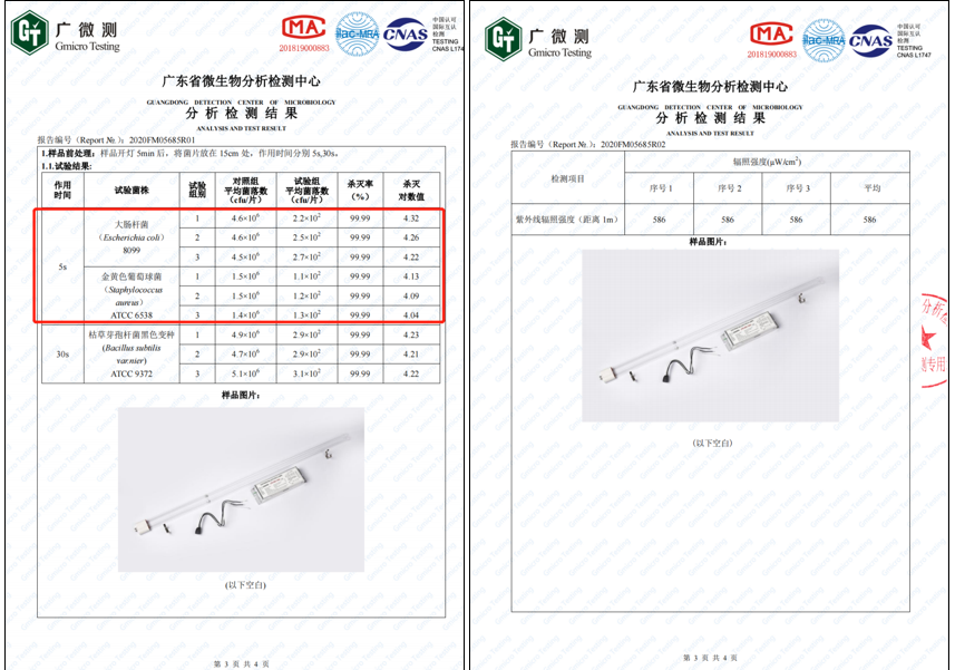 紫外光源第三方檢測報(bào)告:(輻照強(qiáng)度+殺菌率)